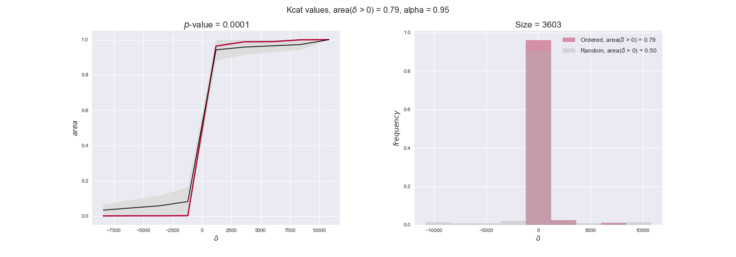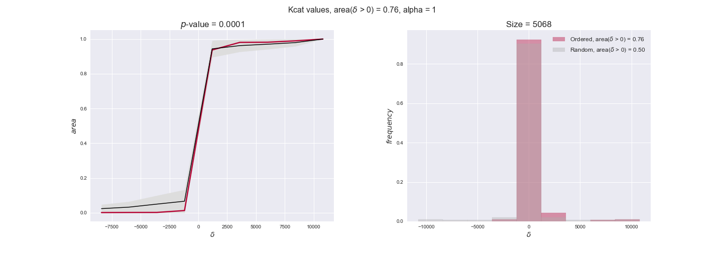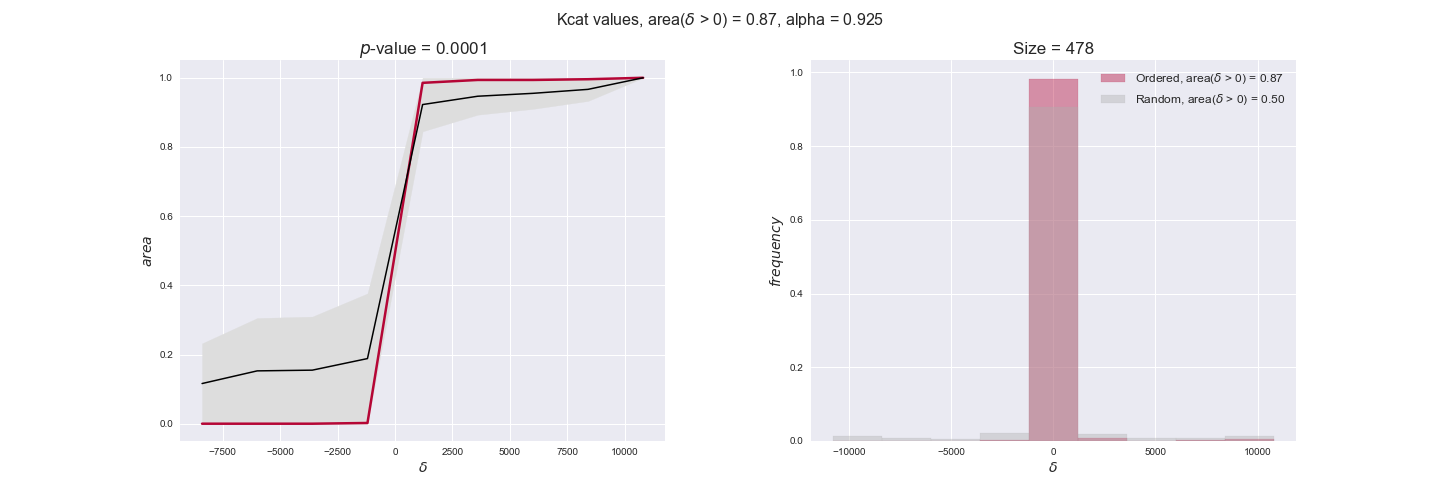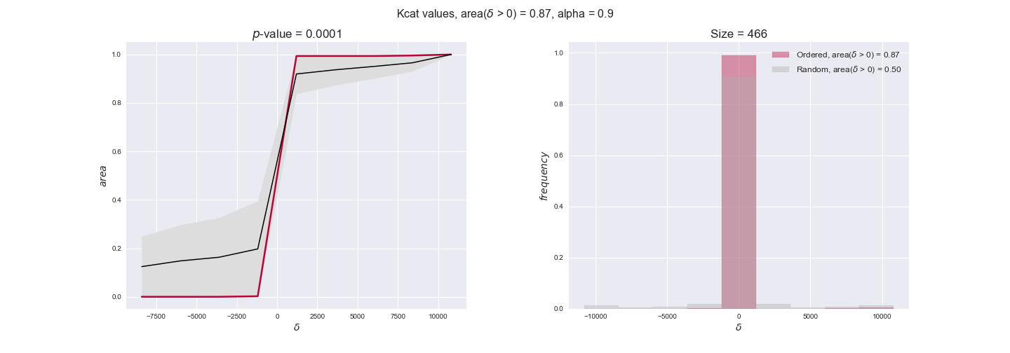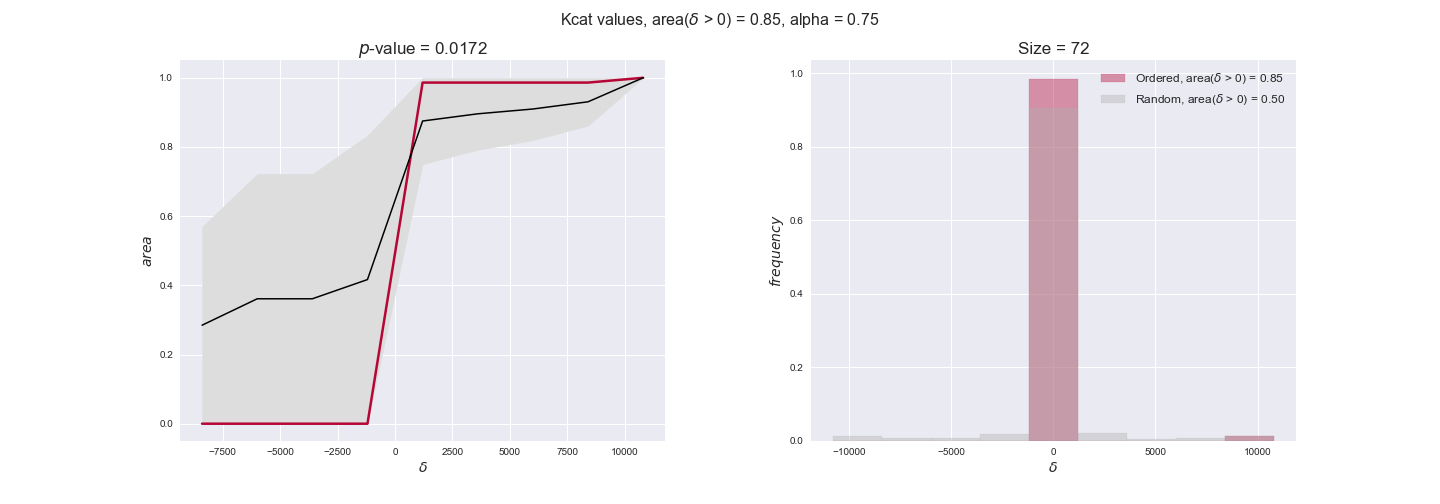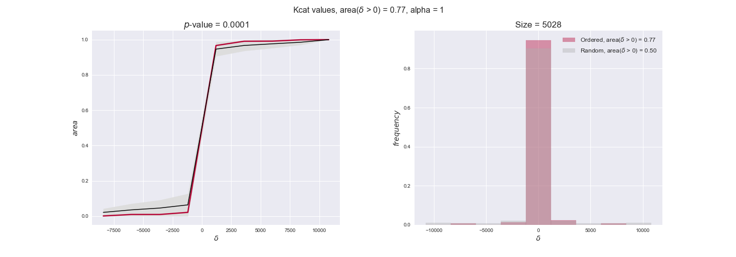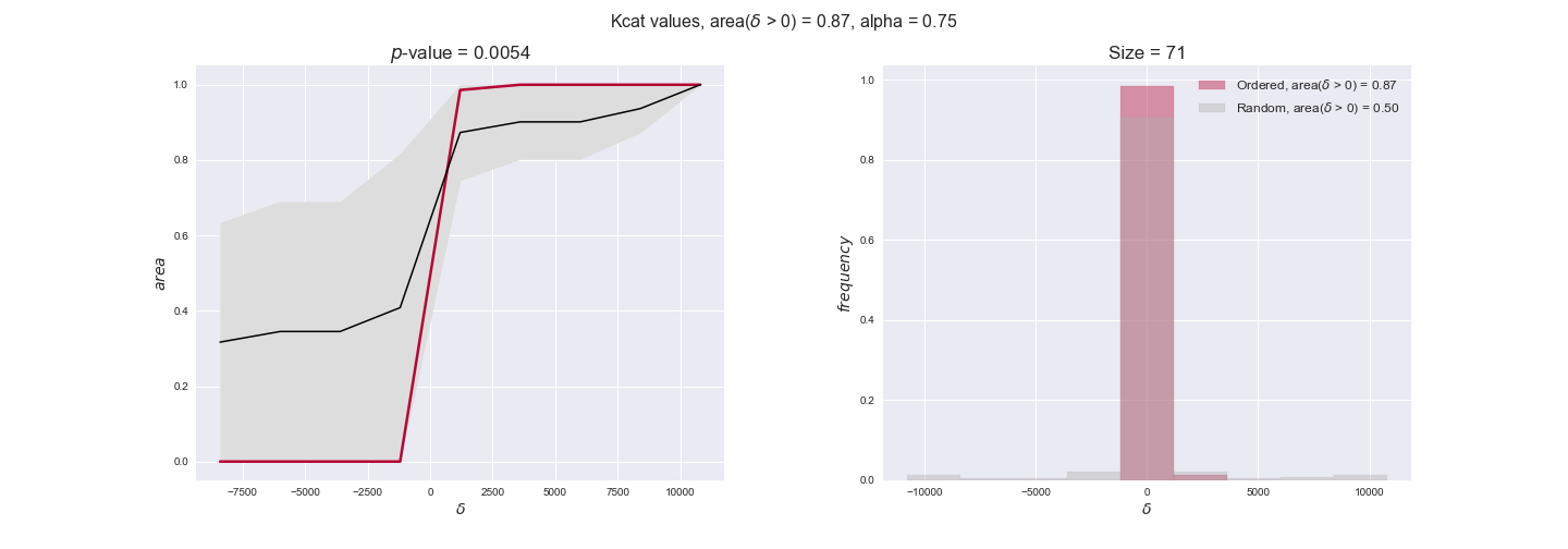 We see that $k_{cat}$ values produce positive differences in approximately 80% of the cases when we use models across carbon sources, thus suggesting that enzymes have optimized this property during evolution to match the flux order relation. Additionally, the $p$-value = $10^{-4}$ is the smallest possible, i.e. none of the samples in the permutation analysis produced an equal or more extreme observation, thus results are solid. There are two observations here. On the one hand, optimizing $k_{cat}$ values would further minimize metabolic costs since increasing reaction rate to match the order relation would be done by modifying the catalytic rate instead of the number of enzyme copies. On the other hand, there is experimental evidence indicating that many enzymes, particularly in central metabolism, operate under substrate saturation — in conditions in which reaction rate is independent of substrate concentrations. In this latter case, $k_{cat}$ values correlate even better with reaction fluxes since reaction fluxes no longer depend on metabolite concentrations.