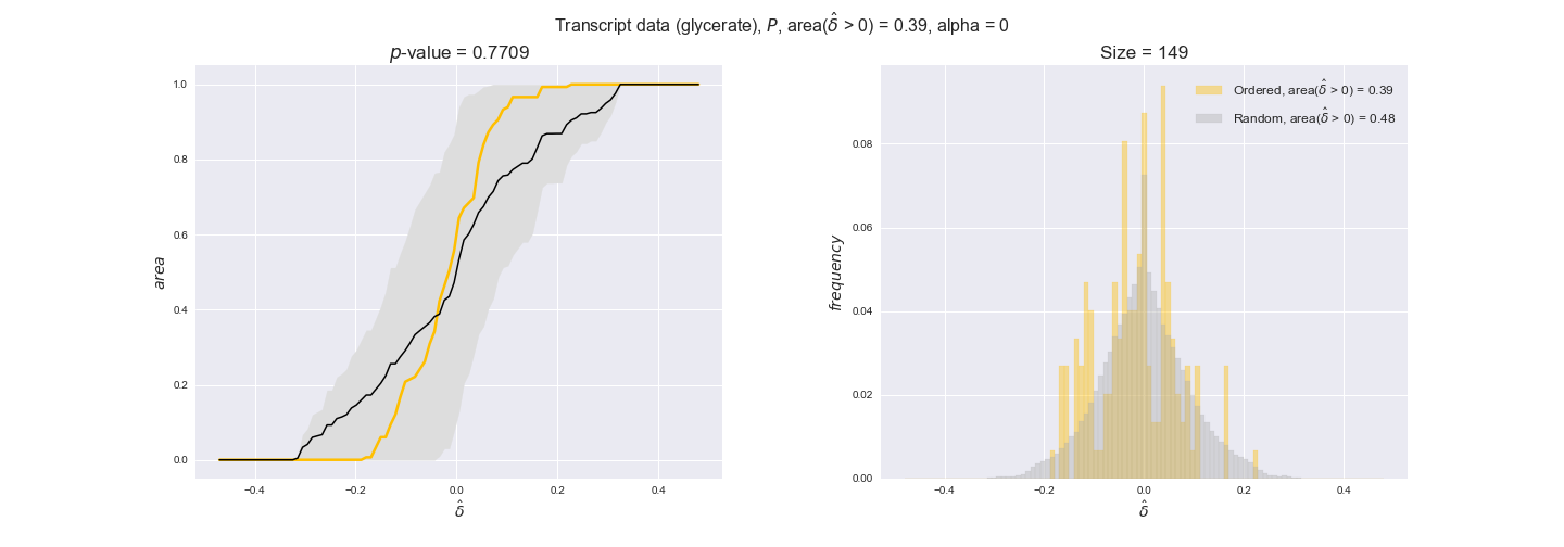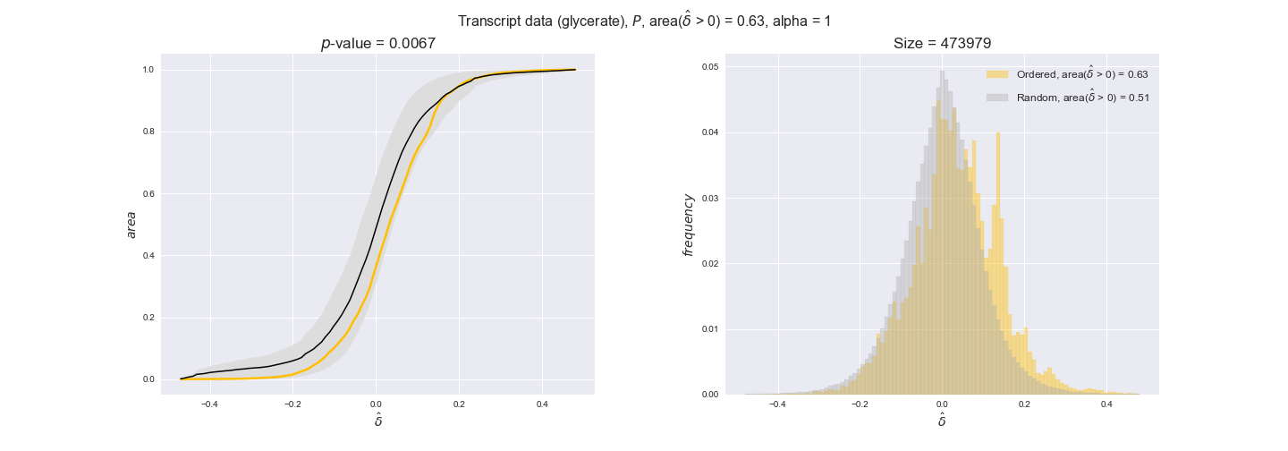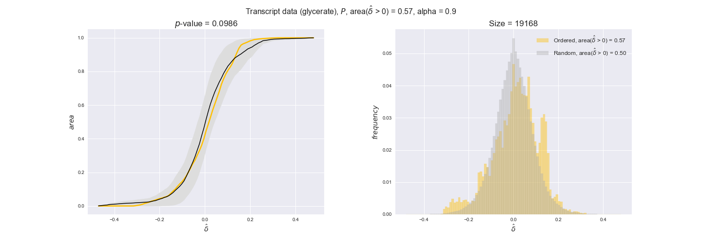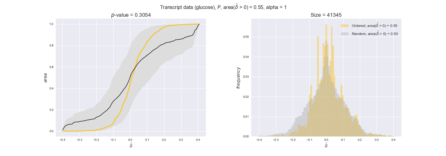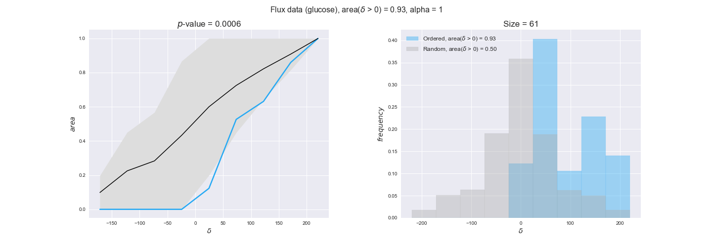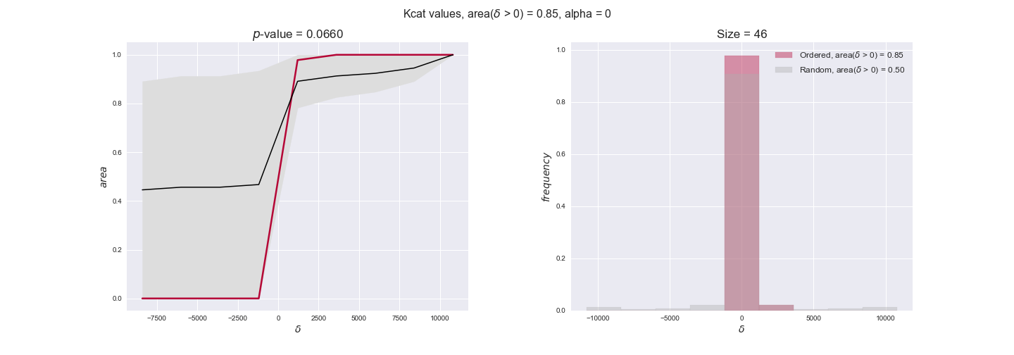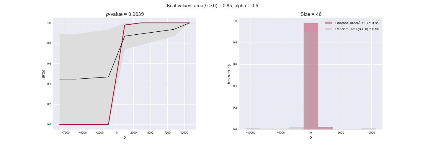 We see that $k_{cat}$ values produce positive differences in approximately 80% of the cases when we use models across carbon sources, thus suggesting that enzymes have optimized this property during evolution to match the flux order relation. Additionally, the $p$-value = $10^{-4}$ is the smallest possible, i.e. none of the samples in the permutation analysis produced an equal or more extreme observation, thus results are solid. There are two observations here. On the one hand, optimizing $k_{cat}$ values would further minimize metabolic costs since increasing reaction rate to match the order relation would be done by modifying the catalytic rate instead of the number of enzyme copies. On the other hand, there is experimental evidence indicating that many enzymes, particularly in central metabolism, operate under substrate saturation — in conditions in which reaction rate is independent of substrate concentrations. In this latter case, $k_{cat}$ values correlate even better with reaction fluxes since reaction fluxes no longer depend on metabolite concentrations.