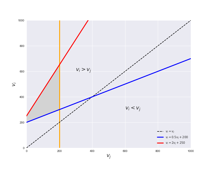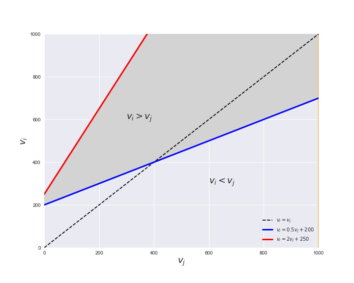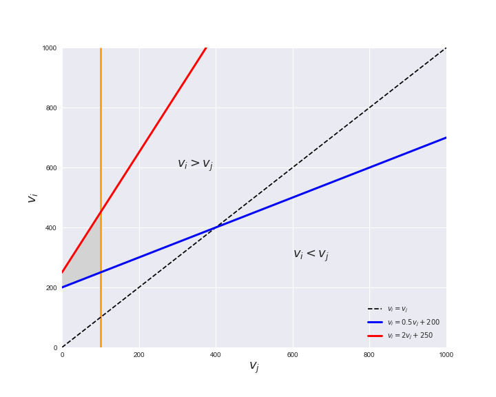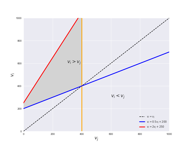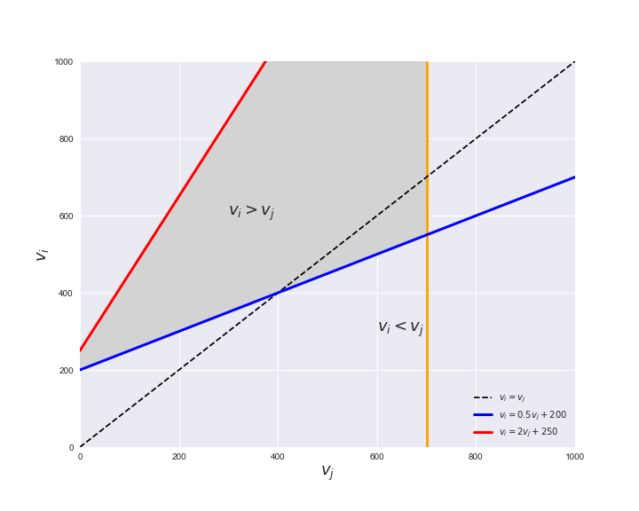 Unlike flux coupling relations, the flux order relation depends on the flux bounds of each reactions. For instance, in the following interactive figure, we depict the steady-state flux space for two reactions $r_i, r_j$, which is delimited by the two constraints drawn in red and blue. Every flux pair above the dashed line representing $v_i = v_j$ satisfies $v_i > v_j$. Now, the adjustable golden line depicts the flux upper bound of reaction $v_j$. We see that only when the upper bound reaches a value of 400 the reaction pair becomes flux-ordered, since the feasible region, shaded in grey, lays entirely above the dashed line. This dependency of the flux-order relation of the flux bounds is also the reason why different sets of flux-ordered pairs may be found under different simulated conditions, such as the three carbon sources evaluated here.